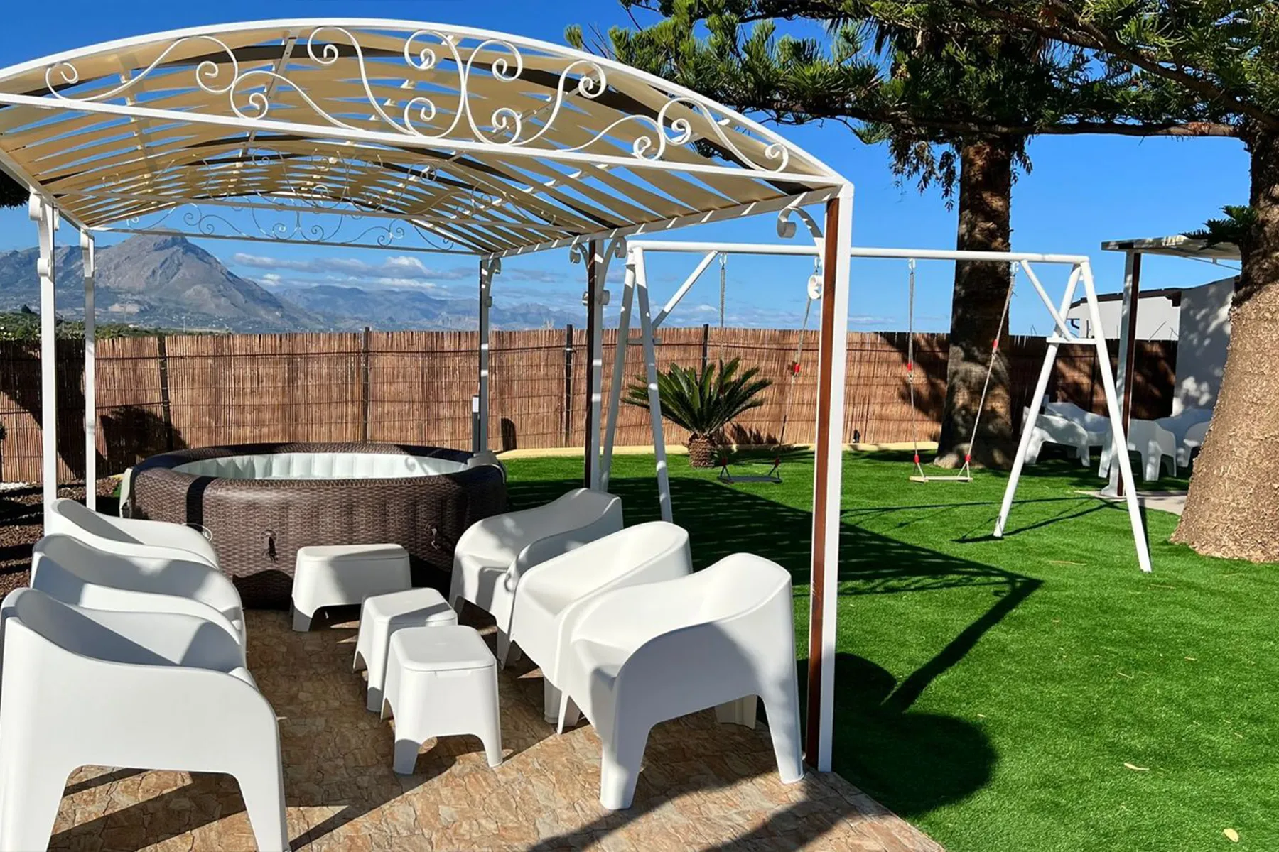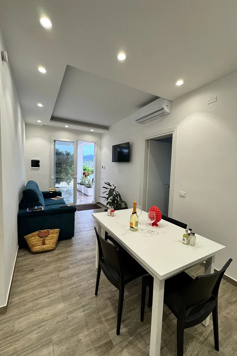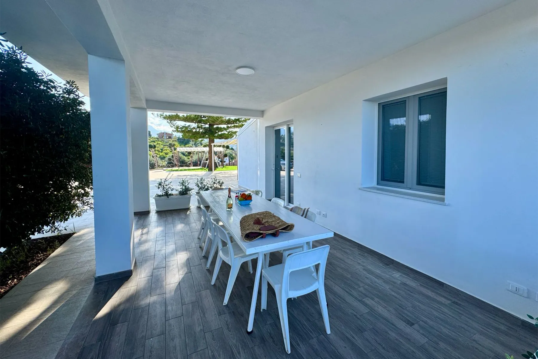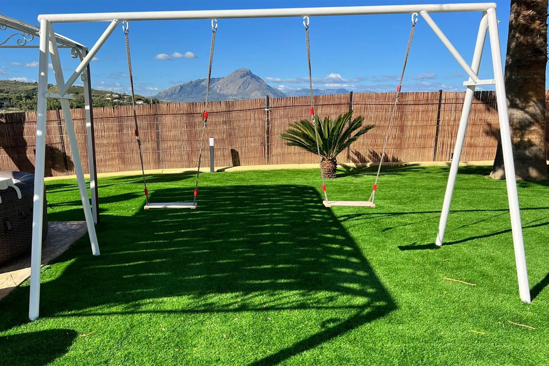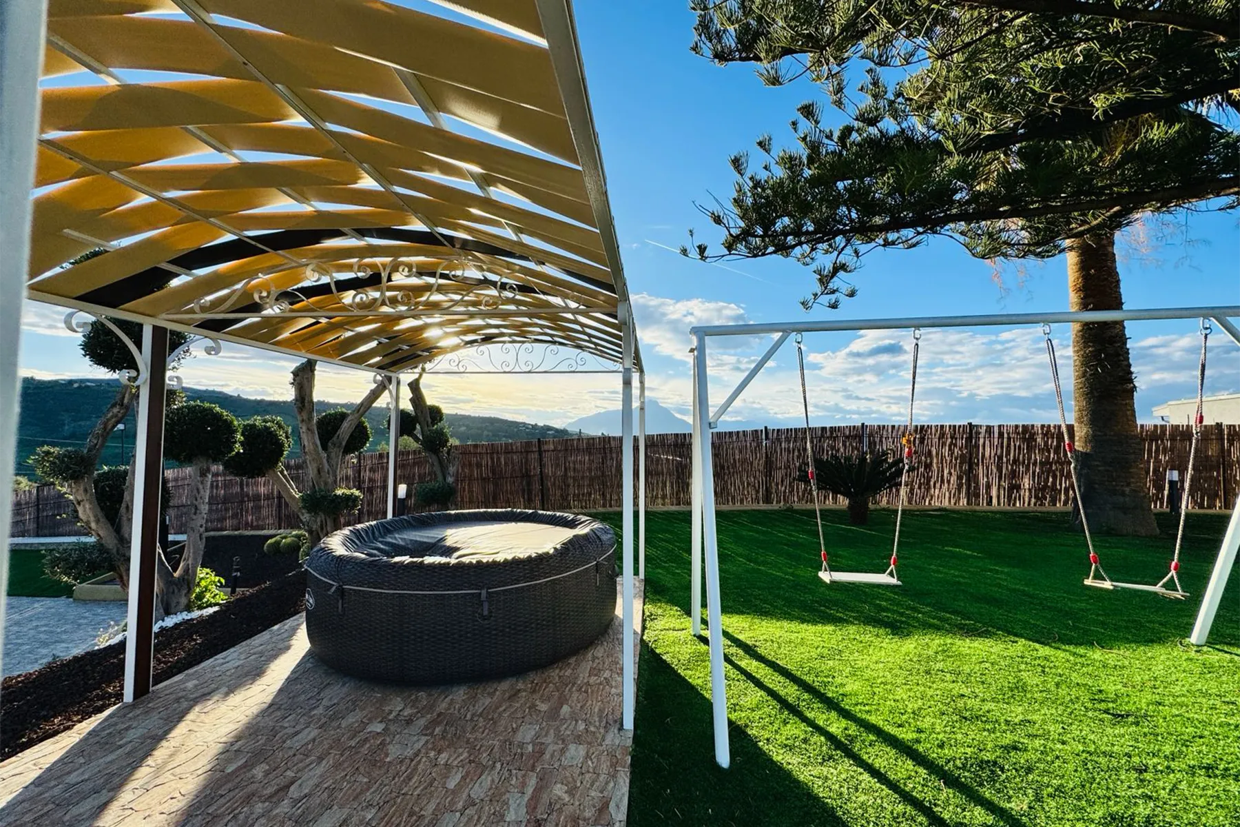 Gli ambienti sono arredati con gusto e circondati da un ampio giardino, fruibile in ogni momento della giornata. All’esterno sono presenti tavolo e sedie per pranzi e cene all’aperto, zona solarium con lettini e ombrelloni, oltre ad un’area con altalene, per i più piccoli, da cui si può godere di una splendida vista. All’interno, la villa offre una cucina-soggiorno completamente attrezzata con elettrodomestici, due camere da letto ed un bagno moderno con ampia doccia in vetro.